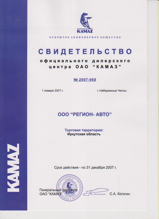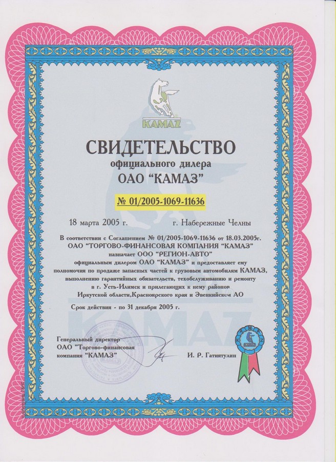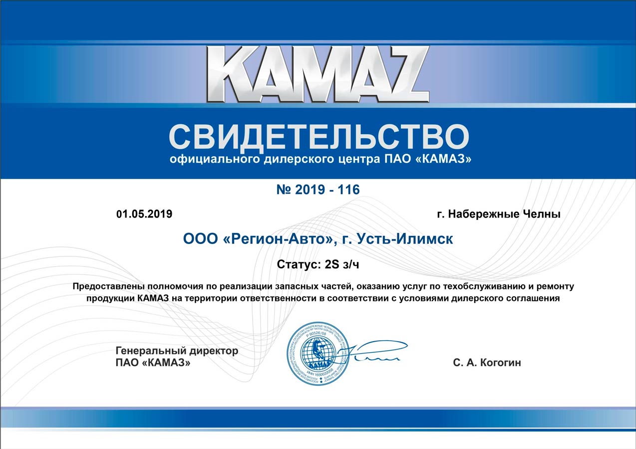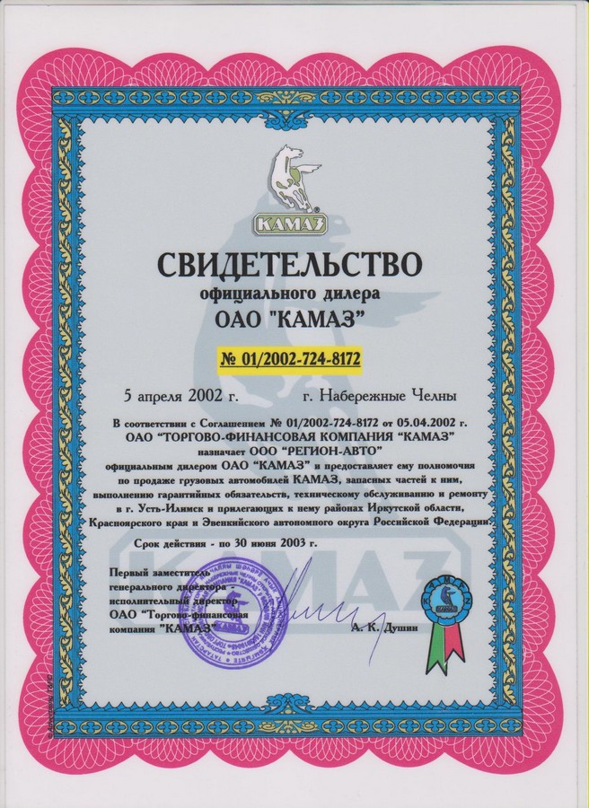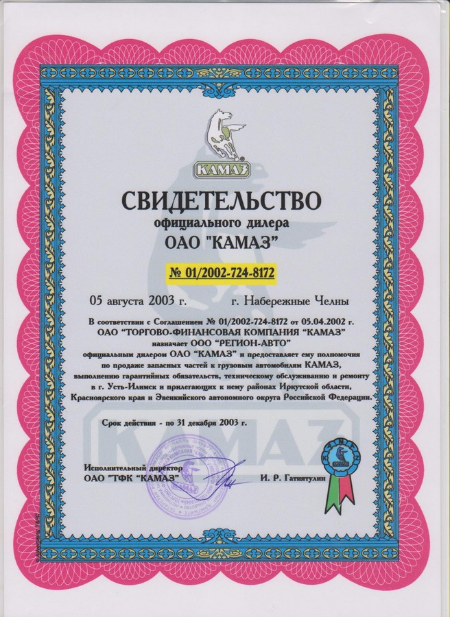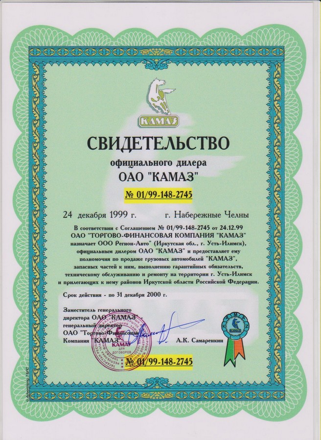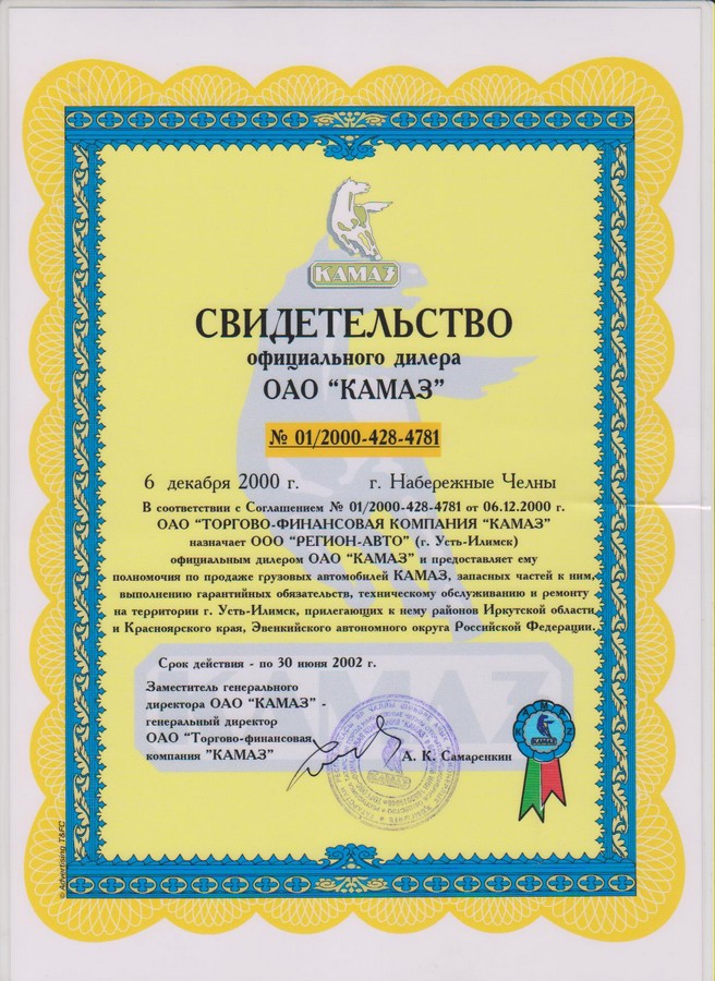 Свидетельства официального дилерского центра ПАО "КАМАЗ"